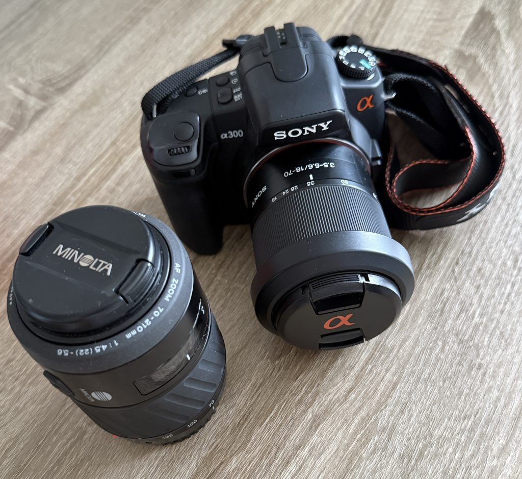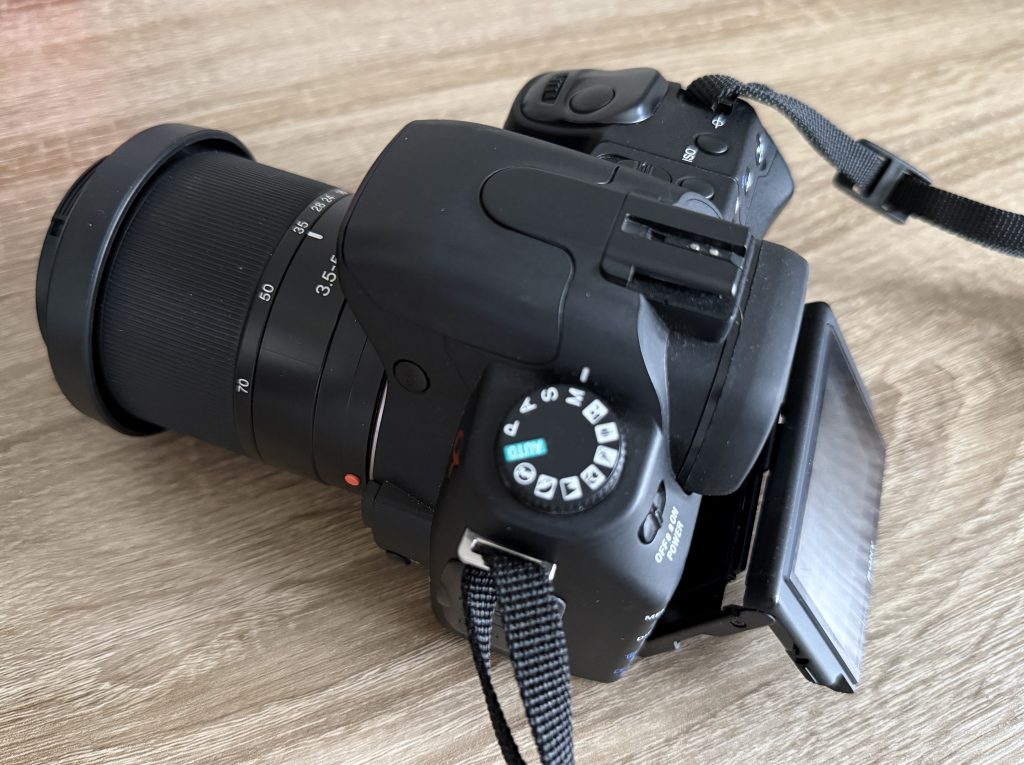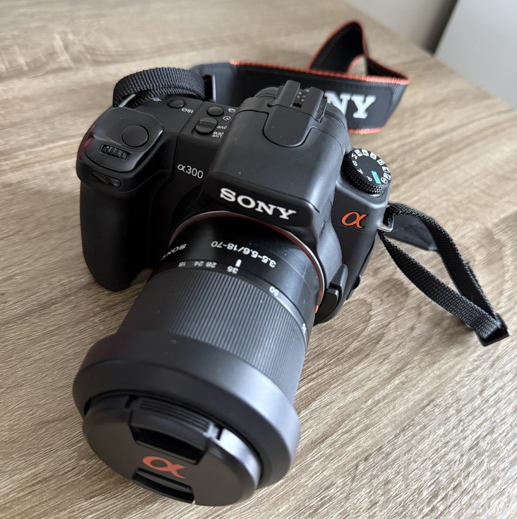 The Sony A300 is perfect for me as a beginner wanting to learn and see how I get on with the hobby before splashing out the big bucks. It is an entry-level digital camera that was launched way back in 2008, hence the price I grabbed it for. It has a 10.2 Megapixel APS-C CCD sensor as well as a very cool (to me) tilting 2.7 LCD screen that has live view, which i am really enjoying when taking photos from low down, its class. Its also has 9 AF points which will do for me but no where near what todays cameras come with, up to 61 AF points 😳.